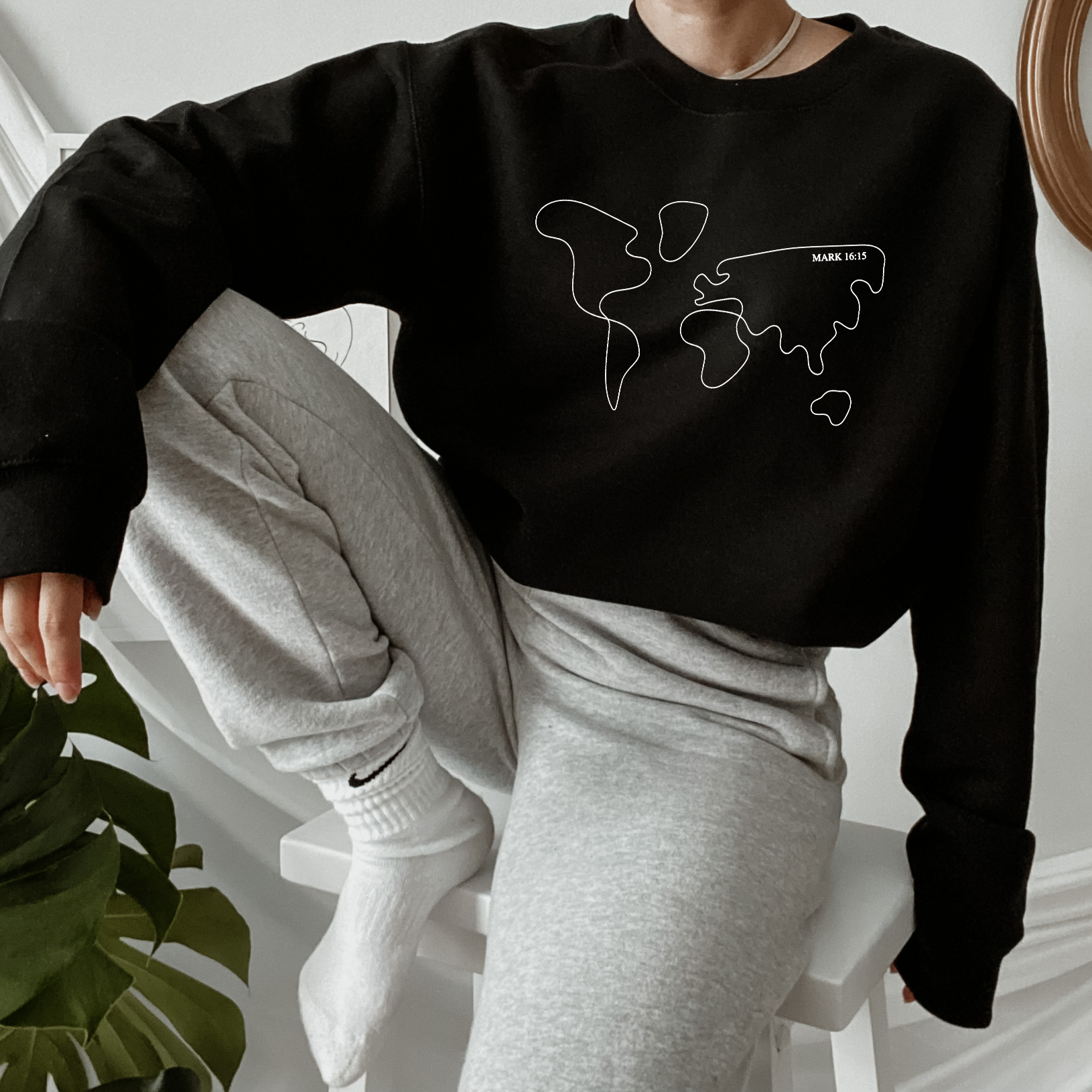 Our map tee is based on the bible verse Mark 16:15 where Jesus says "Go into all the world and preach the gospel to all creation."
