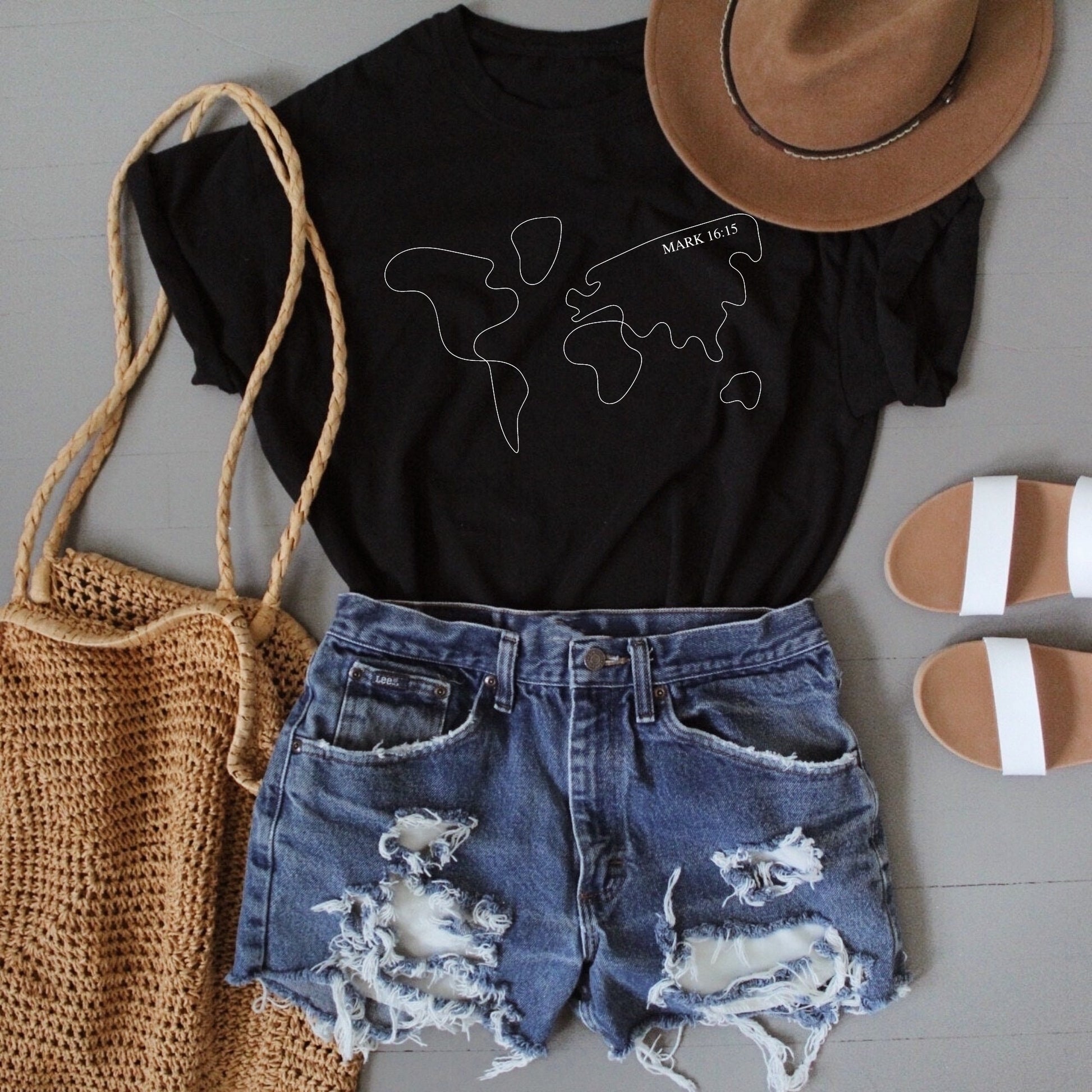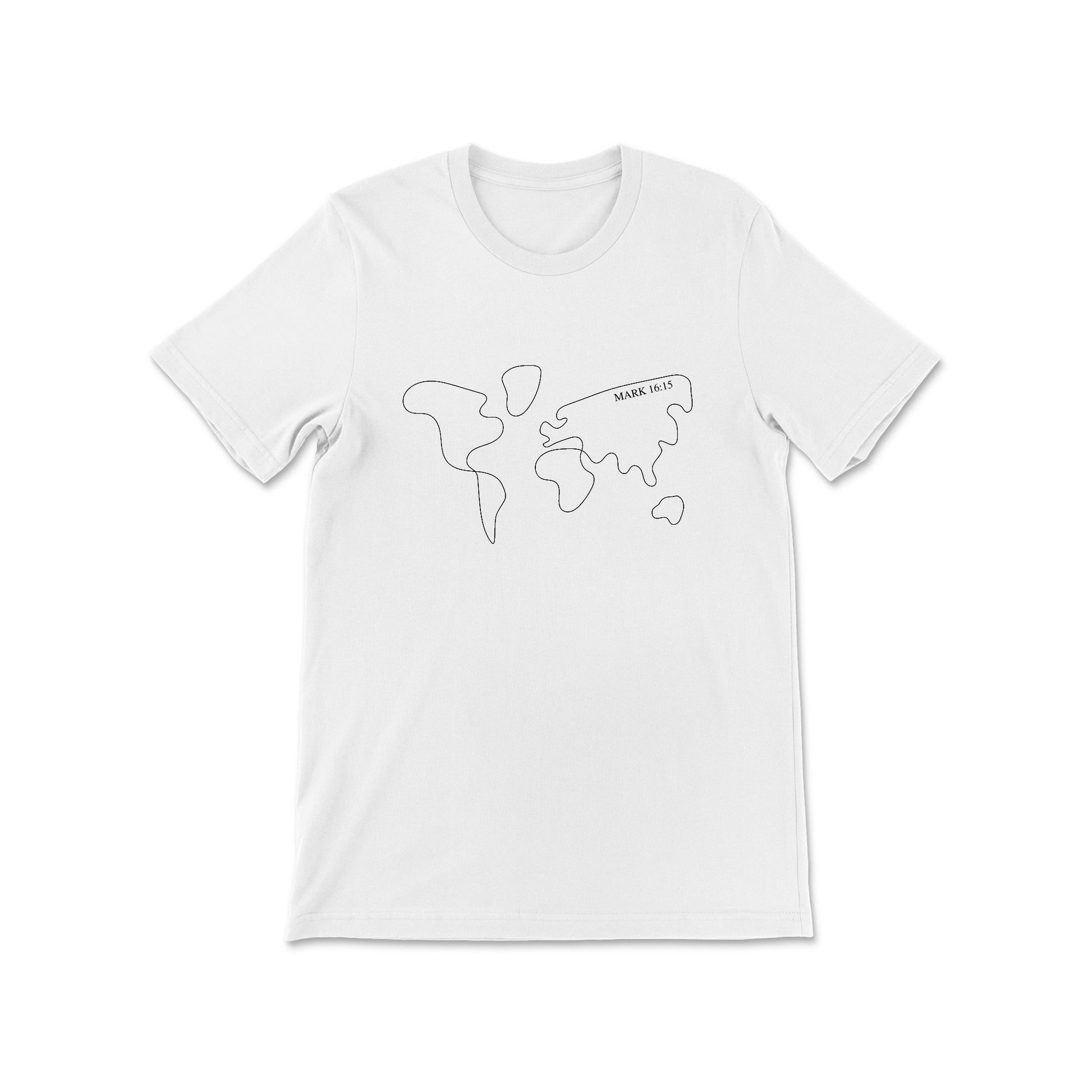 Our map tee is based on the bible verse Mark 16:15 where Jesus says "Go into all the world and preach the gospel to all creation."